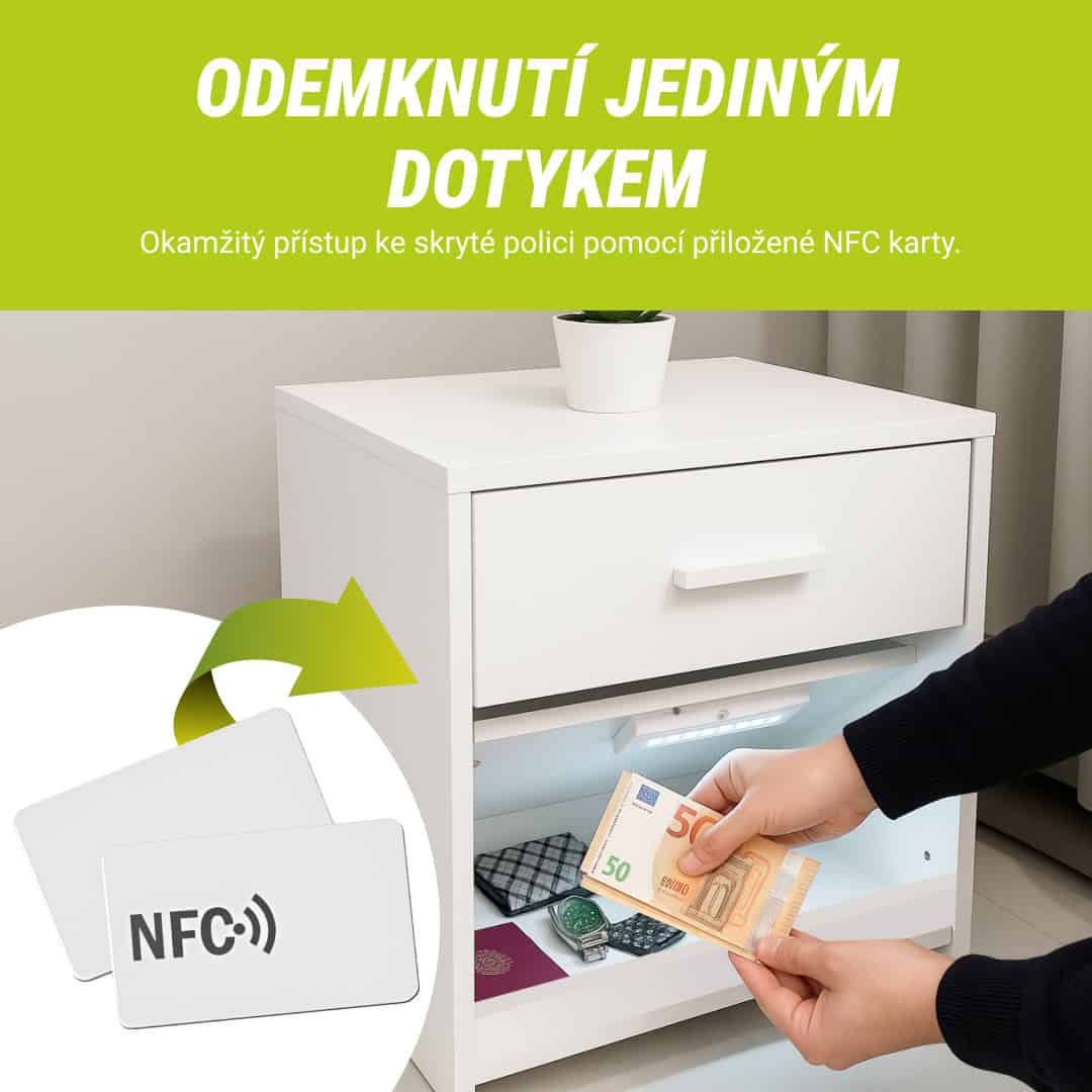 - Chytrý Přístup – Stačí dotyk s přiloženou NFC kartou pro okamžité odemknutí skryté přihrádky.